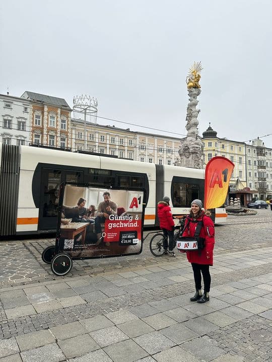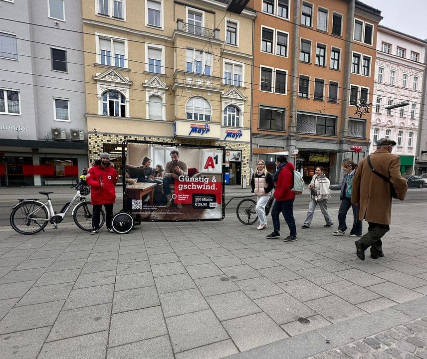 Als zusätzliches Highlight kam ein AdBike zum Einsatz: ein mobiles Werbemedium, das die Kampagne sichtbar durch die Innenstadt trug. Dadurch konnte die Aktion eine noch größere Zielgruppe erreichen und die Reichweite sowie die Markenpräsenz von A1 deutlich steigern.