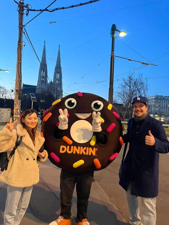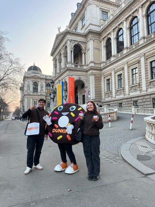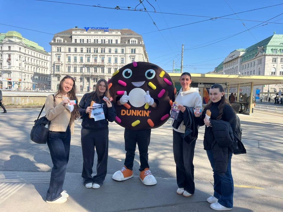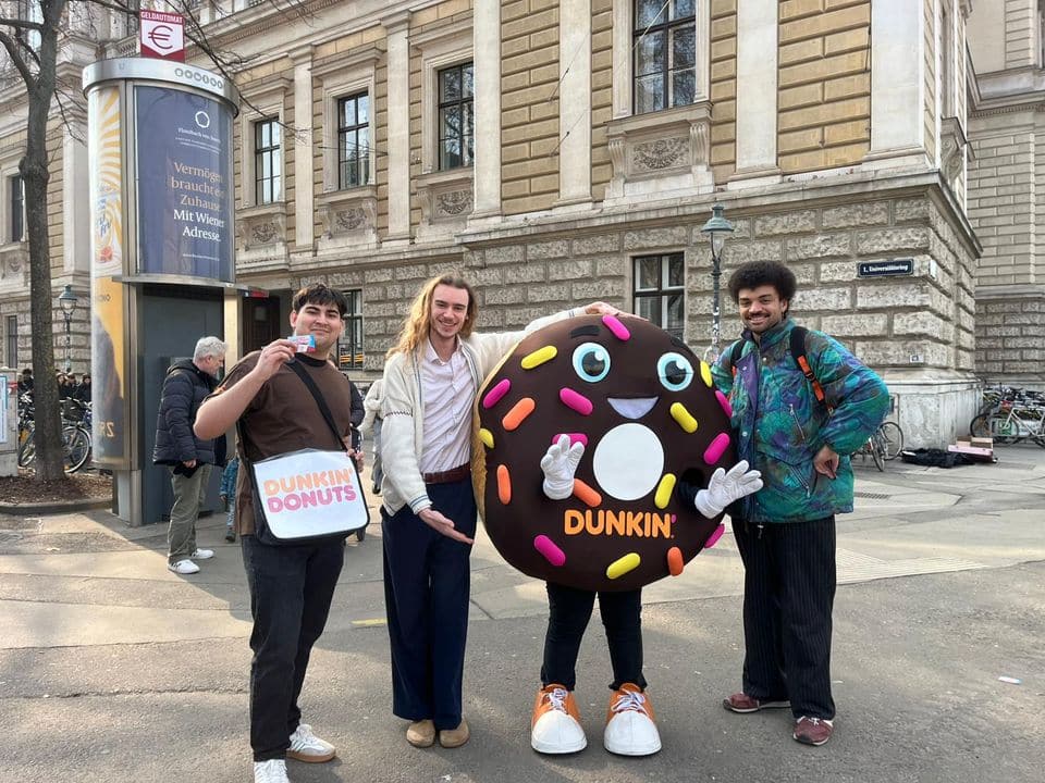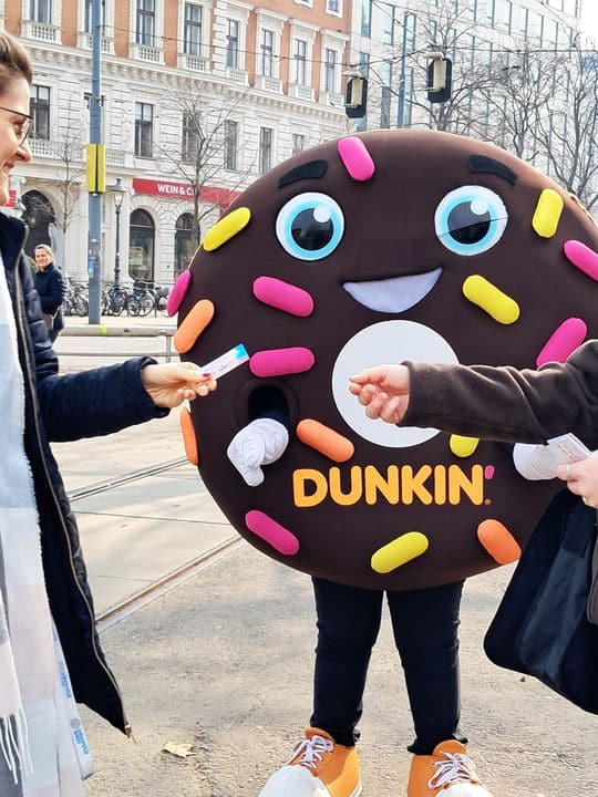 Was passiert, wenn zwei PromotorInnenn mit Gutscheinen und ein Maskottchen von Dunkin' auf die Straßen mitten in Wien treffen? Richtig, ein Mega-Hype! An zwei Tagen wurden vor der Hauptuni Wien und im Umkreis des brandneuen Shops in der Schottengasse Gutscheine verteilt. Wer kann schon "Nein" zu frischen Donuts sagen?